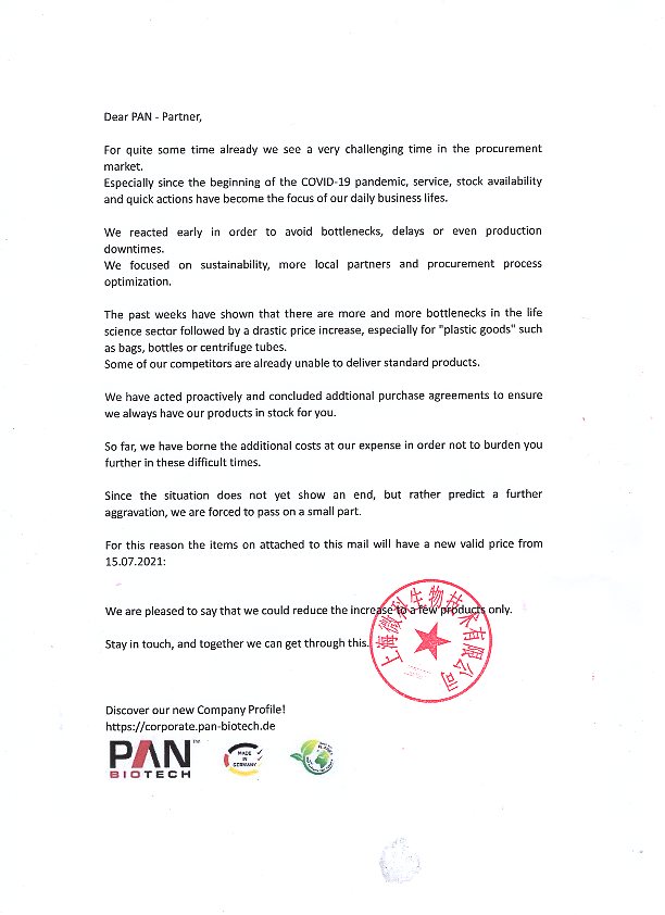 接德國Pan通知 ,從2021年.9.1日想,公司部分試劑受疫苗影響將重新調整價(jià)格,詳細請見(jiàn)通告!